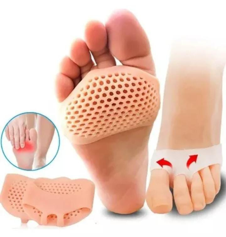 Almohadilla de Silicona para Metatarso y Antepié con Separador de Todos los Dedos (Par): Dispositivo ortopédico diseñado para aliviar la presión y el dolor en el metatarso y el antepié. Fabricada con silicona suave, proporciona amortiguación y confort, mientras que el separador de dedos ayuda a alinear y prevenir el roce entre ellos. Ideal para uso diario, ofreciendo soporte y alivio durante largas jornadas de pie o caminando.